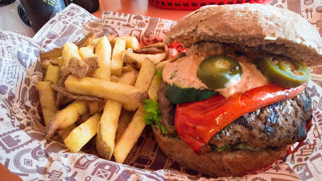 Leuke en grappig atmosphere, voor een mooie prijs krijg je een lekker burger. Ik had de zalm burger en die was een beetje smaakloos en droeg, de andere waren lekkerder. Je besteld en betal in de kassa, en na 5-10 moet je zelf jouw bestelling ophalen. Ideal voor grote groups voor een informele diner.